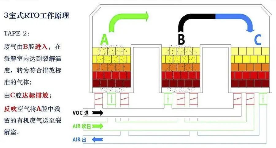 氧化产生的高温气体流经陶瓷蓄热体,使陶瓷体升温而“蓄热”,此“蓄热”用于预热后续进入的有机废气。从而节省废气升温的燃料消耗。陶瓷蓄热室应分成两个(含两个)以上,每个蓄热室依次经历蓄热-放热-清扫等程序,周而复始,连续工作。