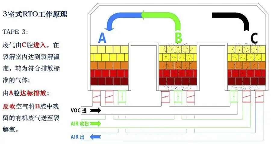 蓄热室“放热”后应立即引入适量洁净空气对该蓄热室进行清扫(以保证VOC去除率在98%以上),只有待清扫完成后才能进入“蓄热”程序。否则残留的VOCS随烟气排放到烟囱从而降低处理效率。