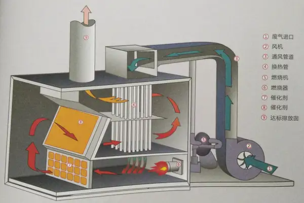在废气进入催化燃烧设备的过程中,废气经管道由风机送入热交换器,将废气加热到催化燃烧所需要的起始温度。经过预热的废气,通过催化剂层使之燃烧。由于催化剂的作用,催化燃烧设备内废气燃烧的起始温度约为250~300摄氏度,大大低于直接燃烧法的燃烧温度650~800摄氏度,高温气体再次进入热交换器,经换热冷却,终以较低的温度经风机排入大气。