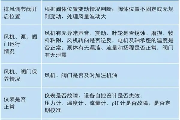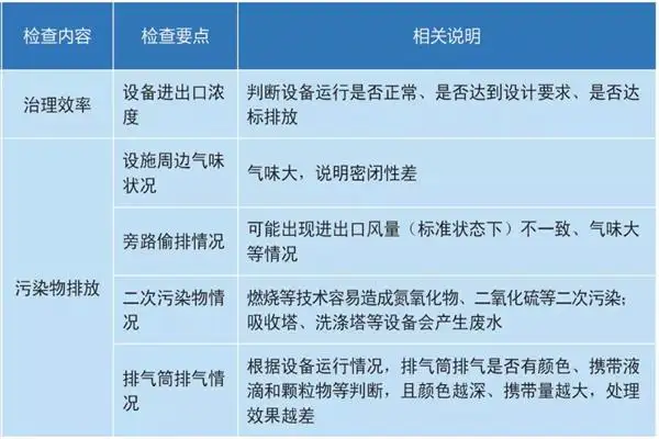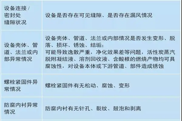 3、定期检查 VOCs废气治理设备状况,包括废气治理设备运行效果、技术参数指标、废气治理设备管道安全、设备壳体、内部、零部件、仪表、阀门、风机等方面。可采用感官判断(目视、鼻嗅、耳闻),现场仪表指示值读取和信息资料收集,量具和便携式检测仪现场测量,现场采样实验室分析等方法。