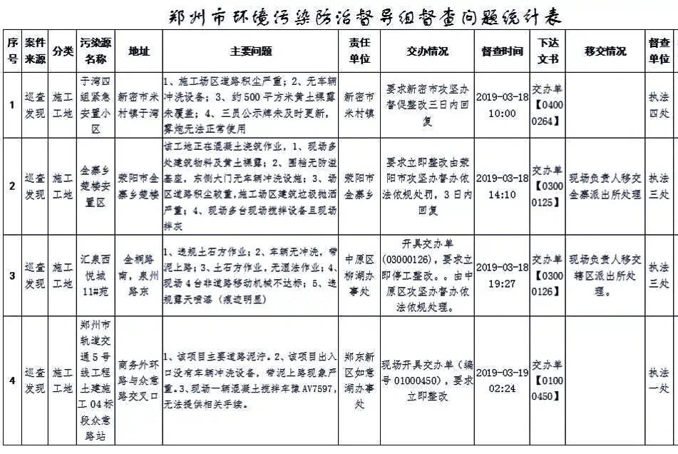 执法一处3月18日22时至19日凌晨3时,检查郑东新区建筑工地及地铁项目共6处,复查郑东新区建筑工地1处,共发现问题5起,口头交办4起,现场开具交办单1份。
